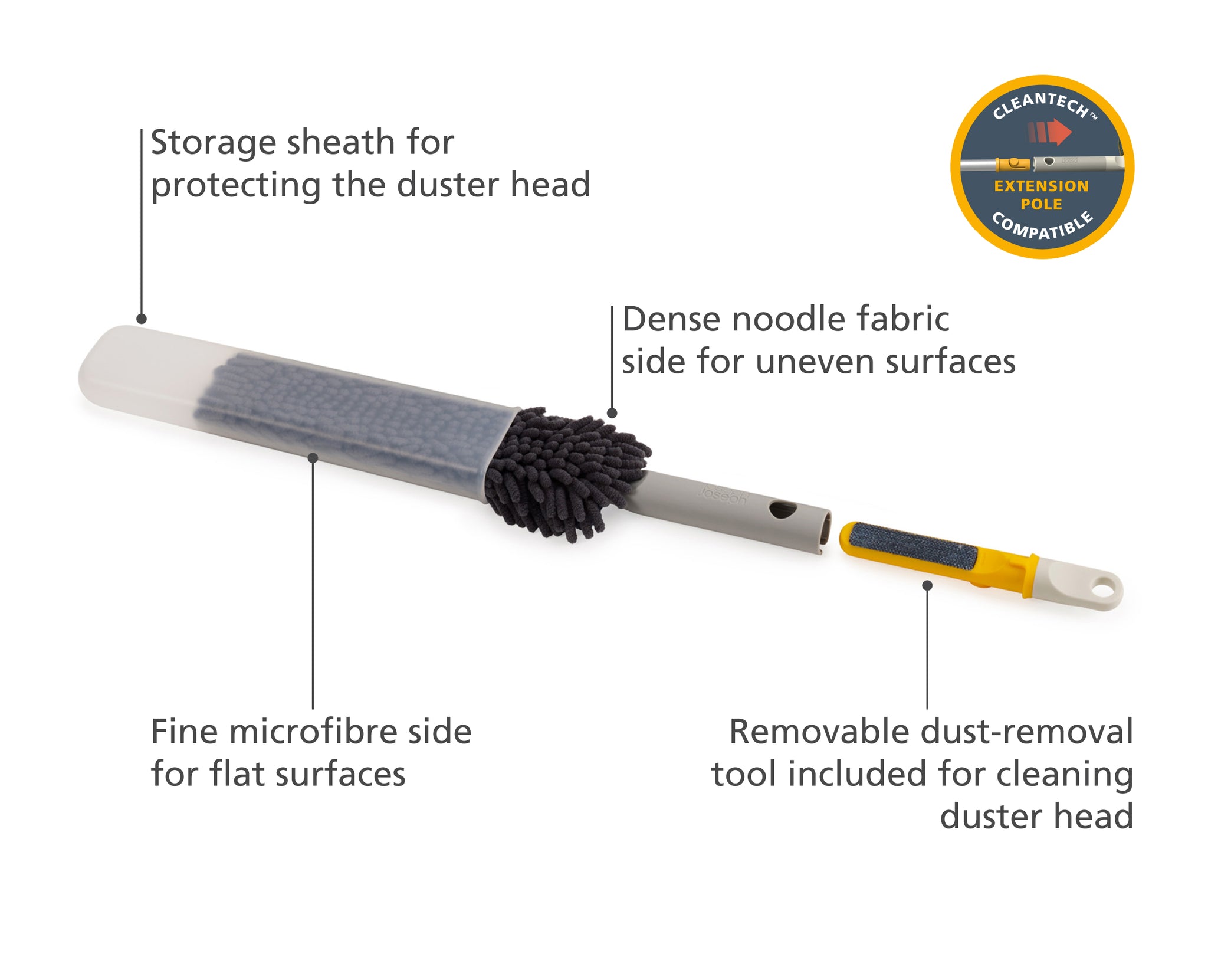 This dual-style duster has a fine microfibre side for flat surfaces and a noodle fabric side for uneven areas. Comes with a dust-removal tool and a storage sheath for easy maintenance and safekeeping.