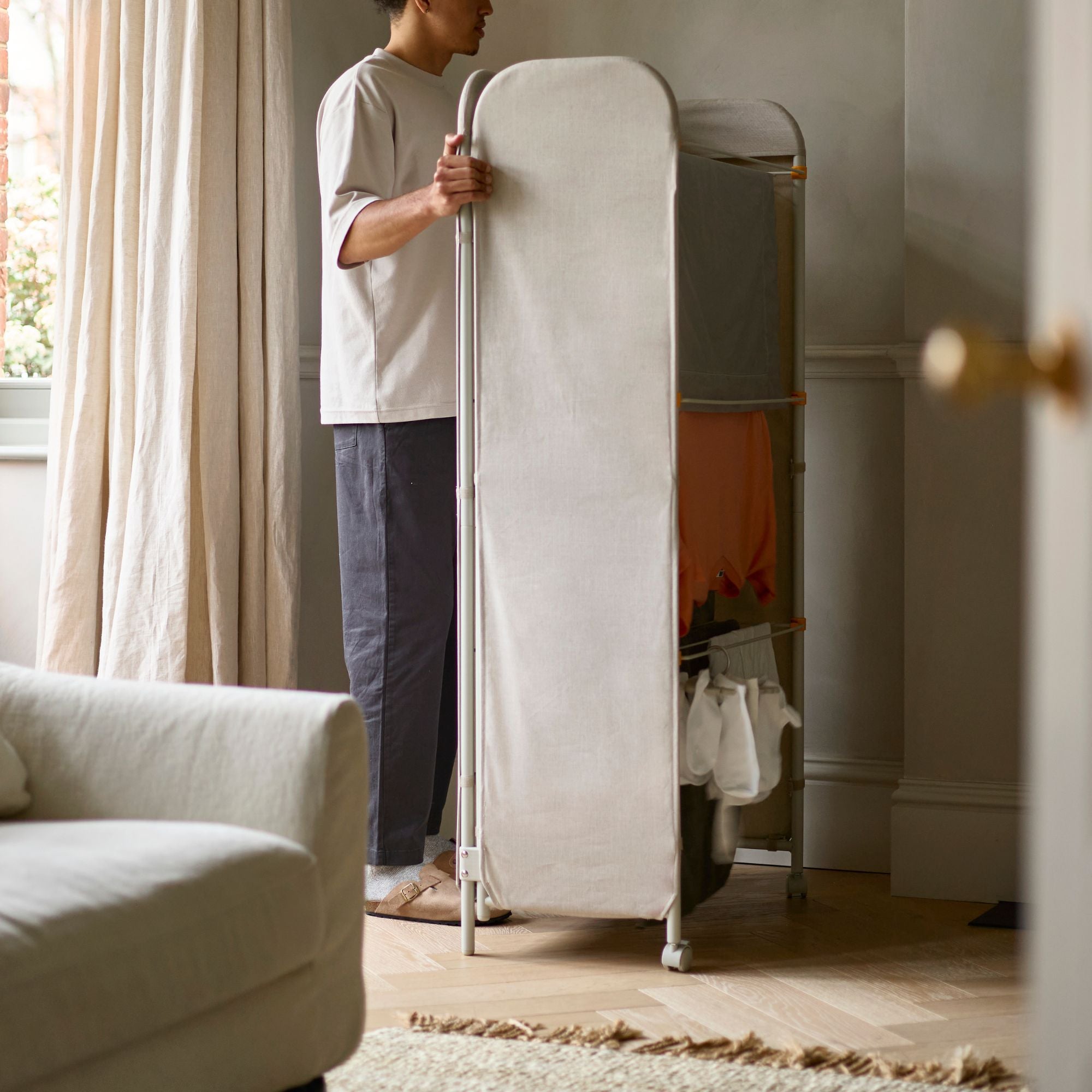 This spacious, 3-tier indoor clothes airer comes with fabric sides that hide unsightly laundry from sight, reducing clutter in your living space and complementing a range of interior styles. Offering generous drying room, the steel tiers can be individually folded down for when you need more space to dry longer items like trousers or dresses.