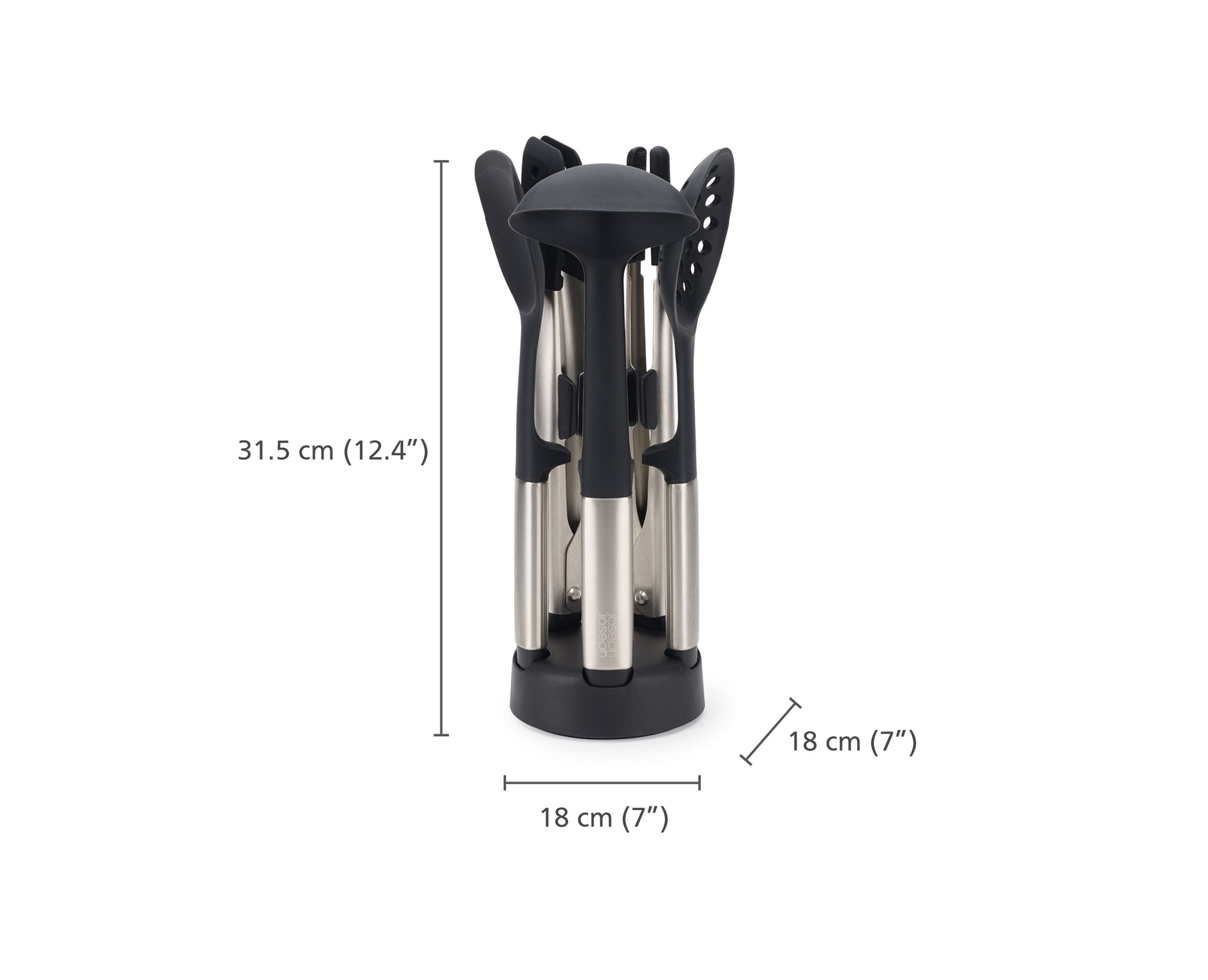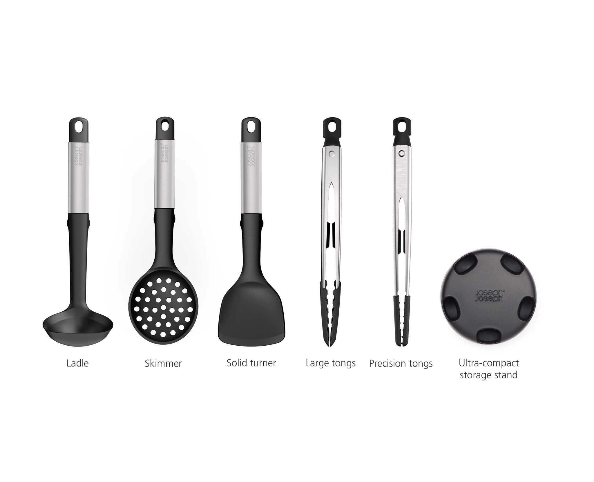 - Set includes solid turner, ladle, slotted spoon, precision tongs, large tongs