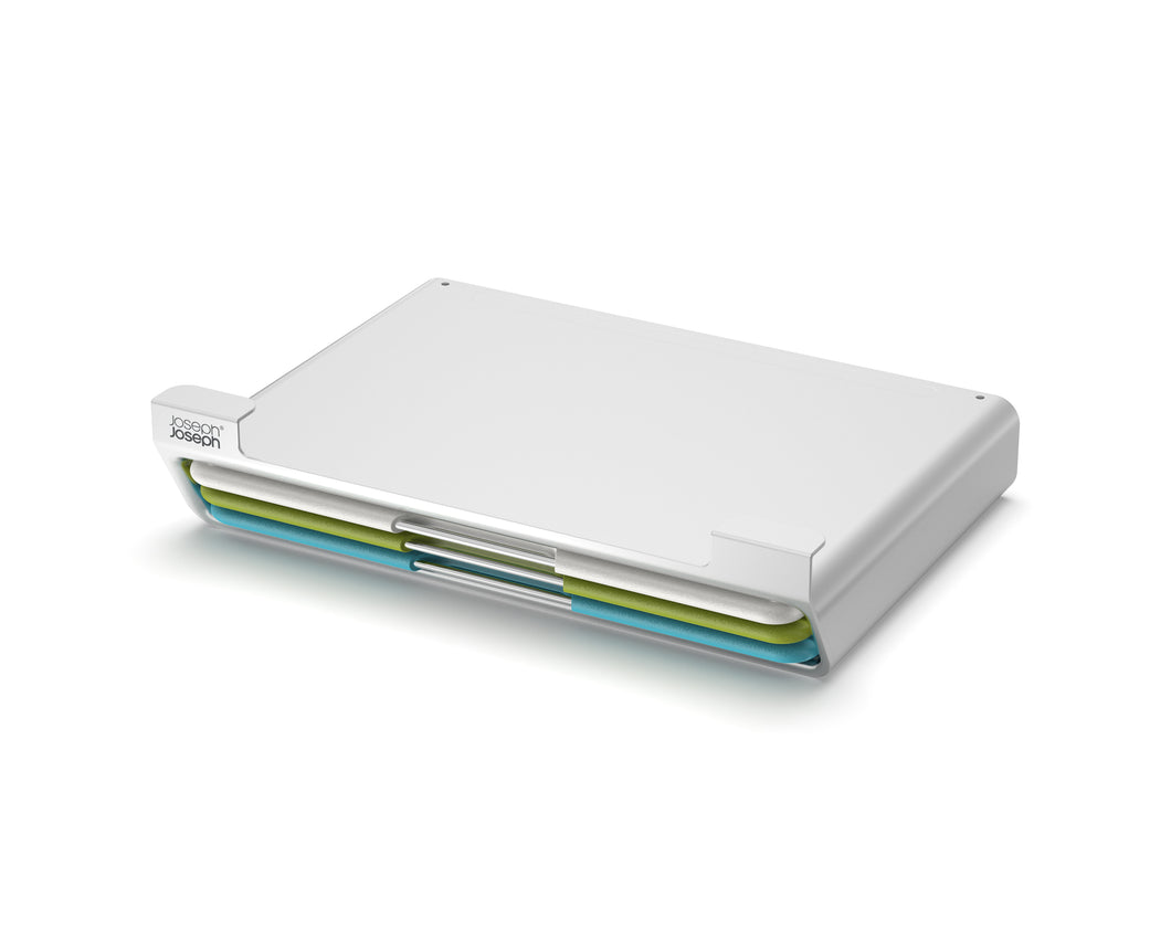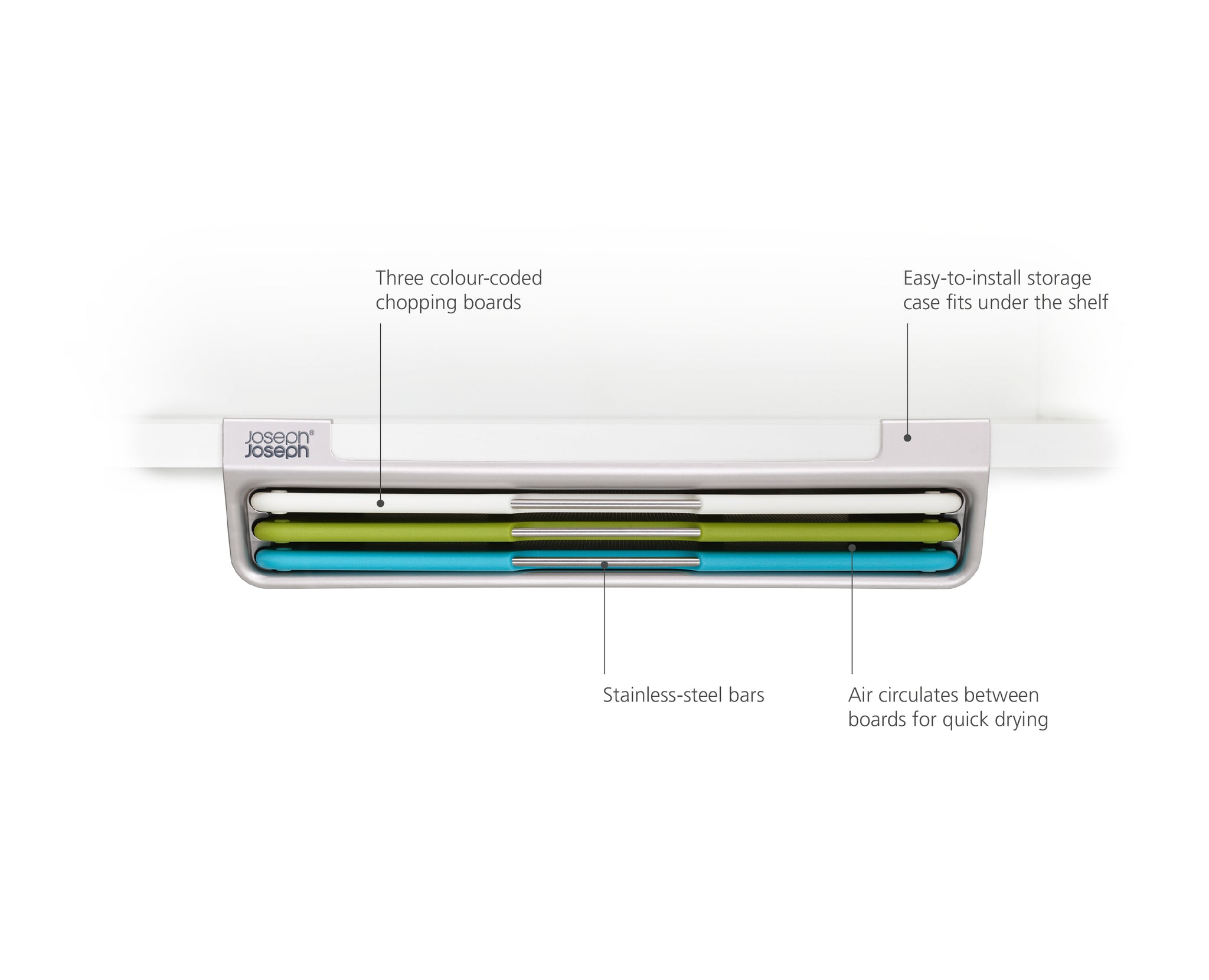 Chopping boards are a daily essential in the kitchen, but for those who prefer to keep the worktop clear of clutter, Folio™ Slim presents a new way to store them. This innovative set, which includes three colour-coded and knife-friendly chopping boards, features a slimline storage case that – wait for it – hooks onto the shelf for space-saving storage, keeping your chopping boards off the worktop and within easy reach.