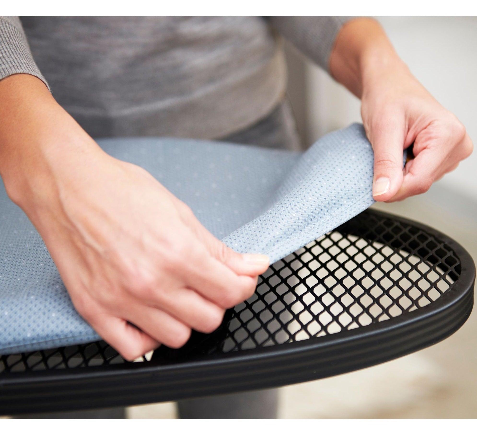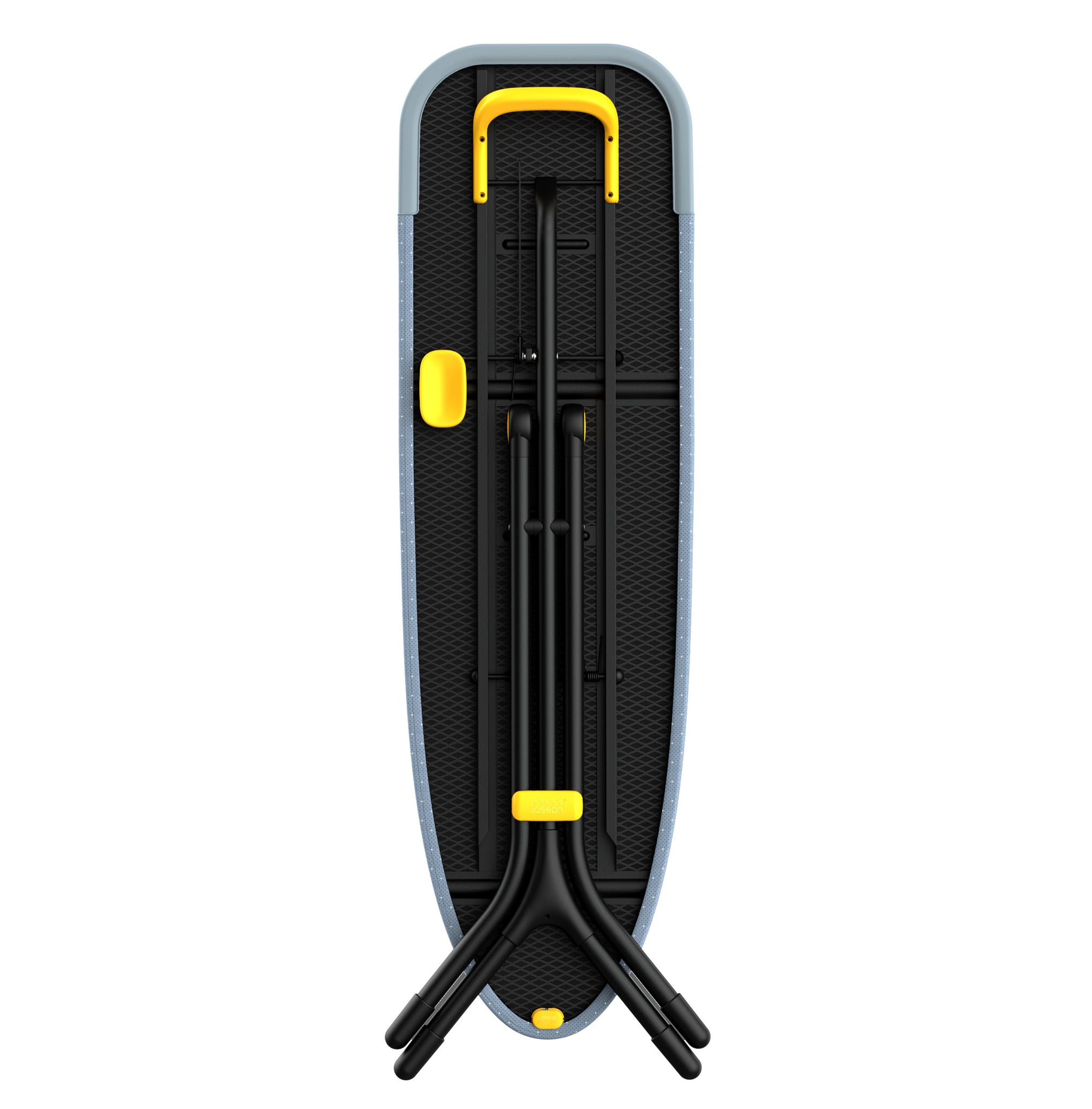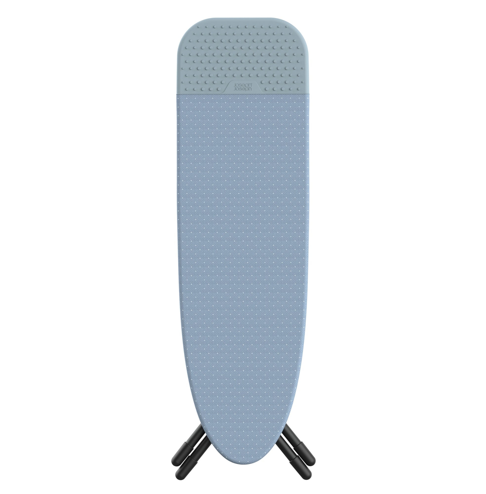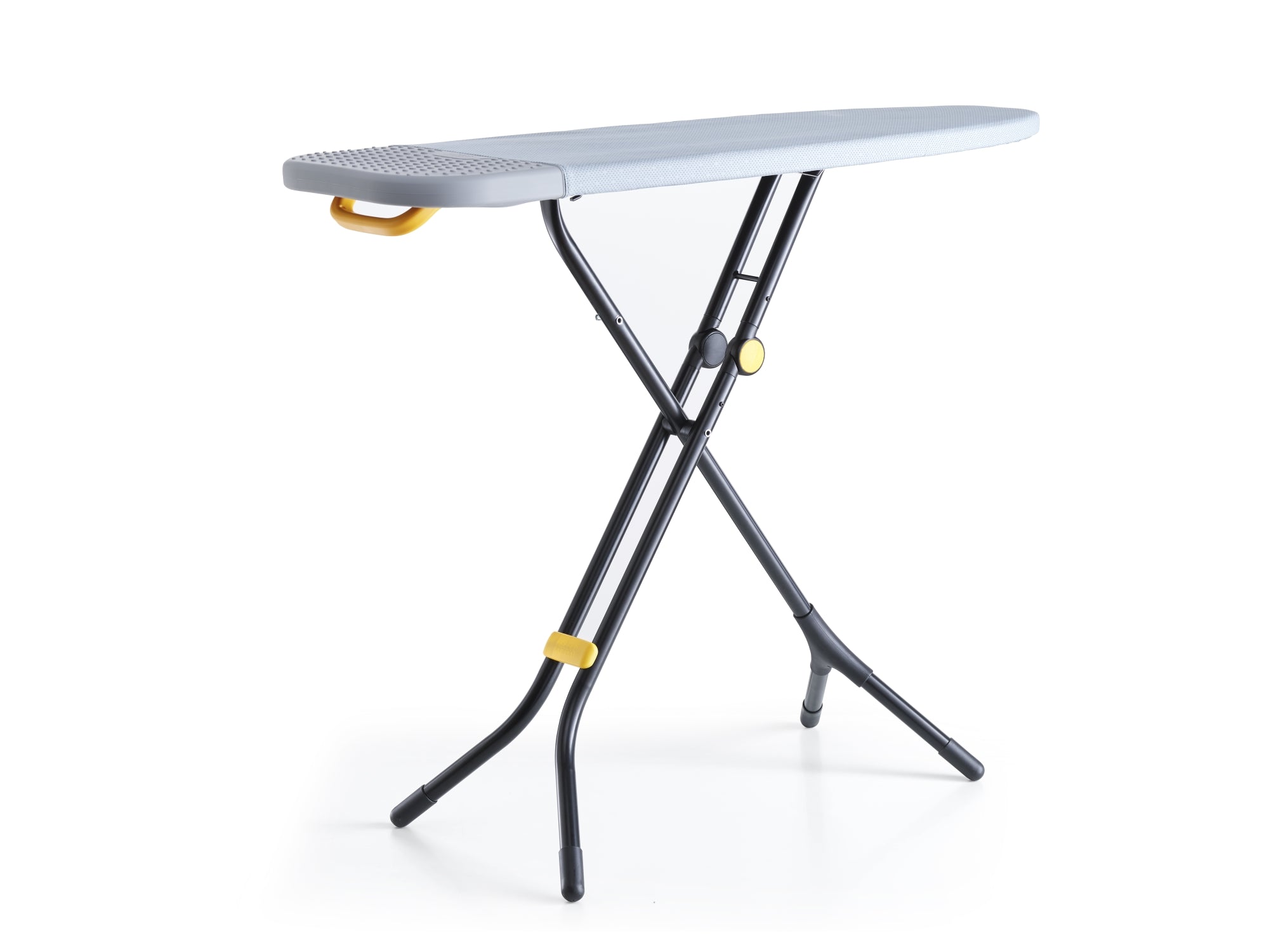 This revolutionary, full-size ironing board features a unique stand design that makes it more compact when stored than other conventional ironing boards.