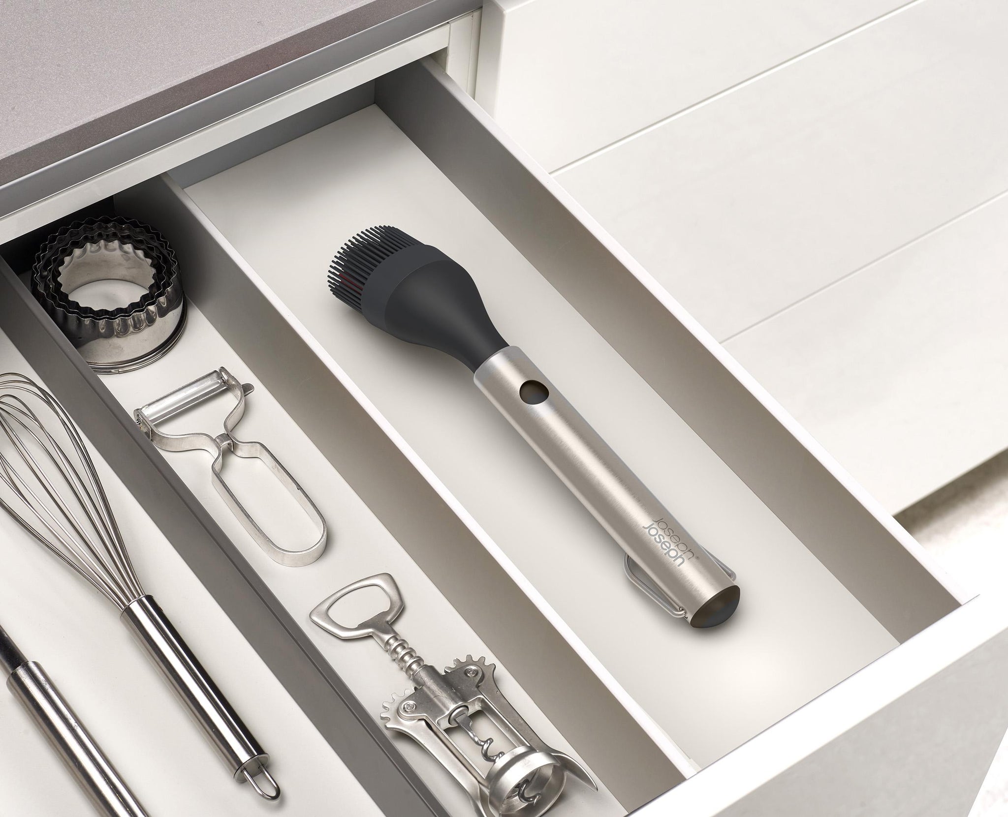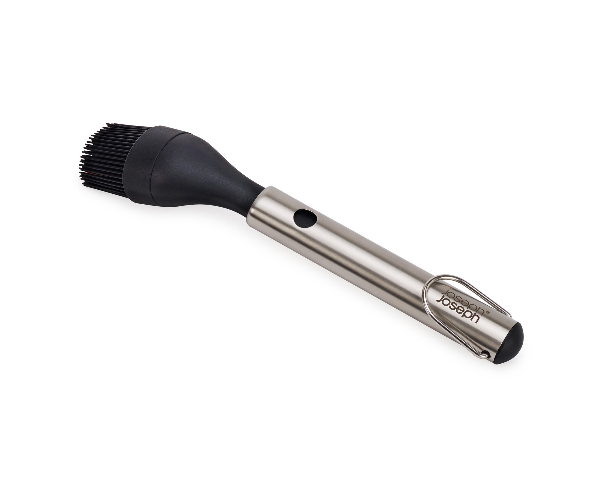 This stainless-steel basting brush features retractable, high-heat silicone bristles for easy basting, and a removable head and hanging hook for compact storage.