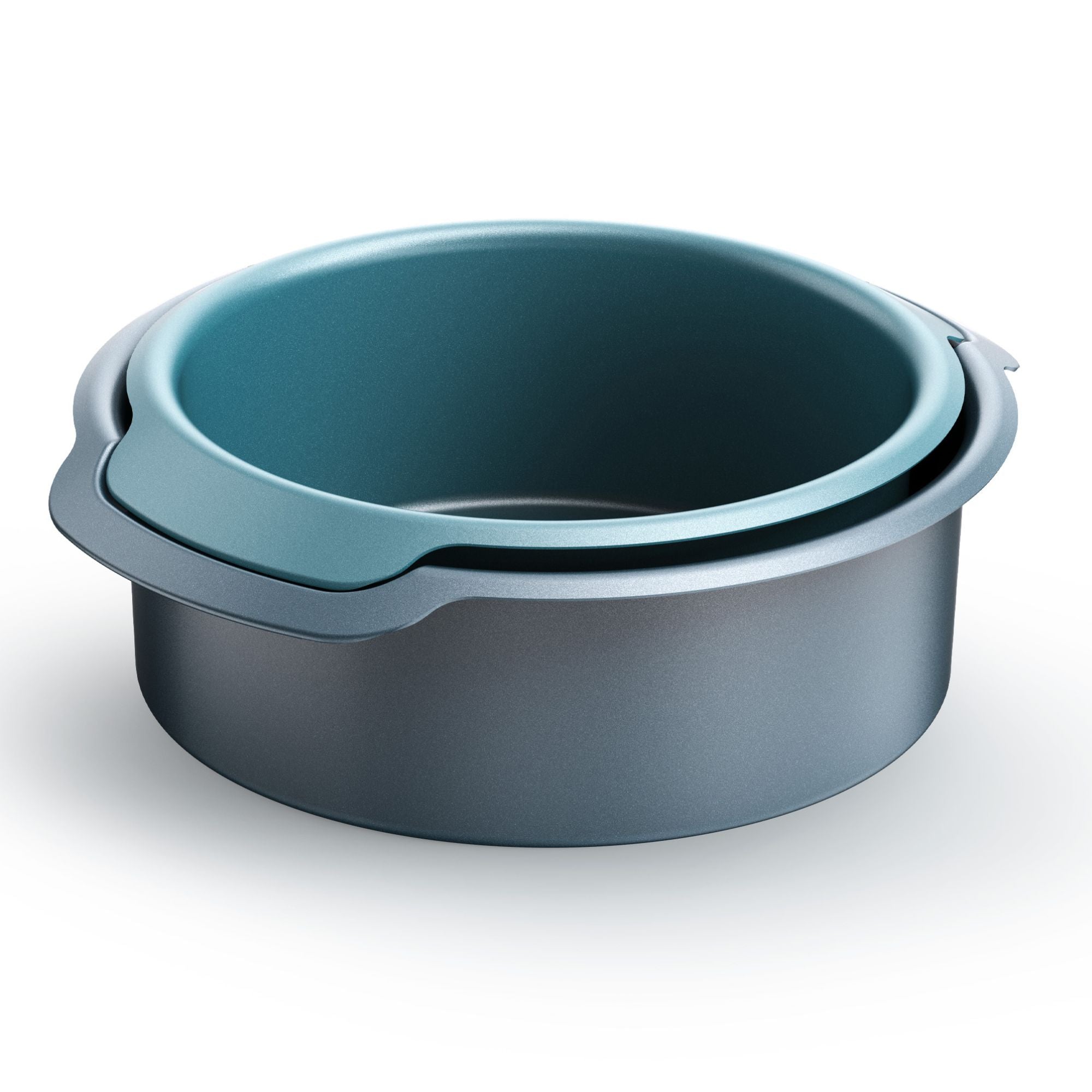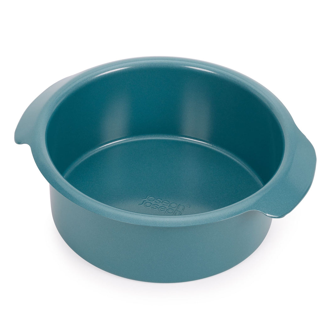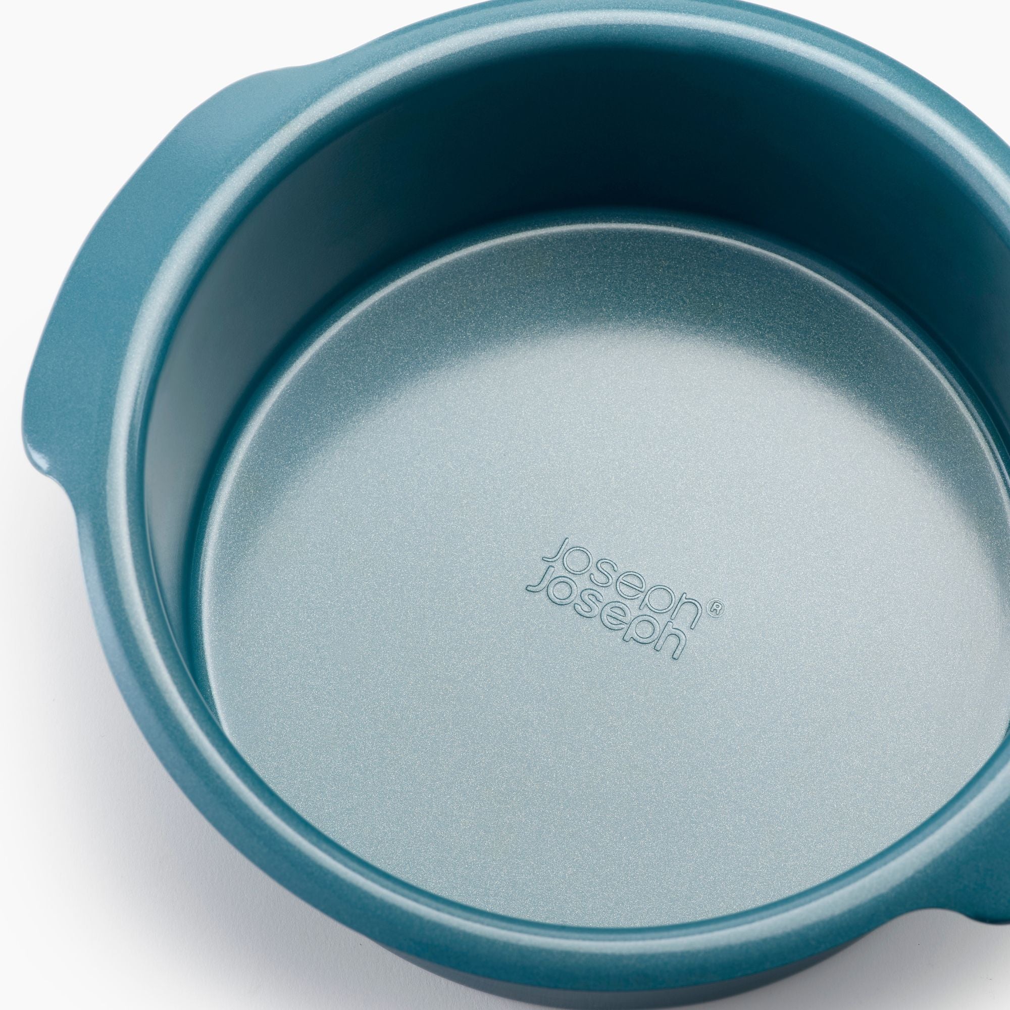This stackable round cake tin features easy-pull handles on the sides to provide a larger gripping point when wearing oven gloves, making it easier and safer to handle.