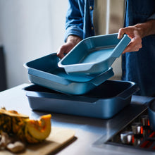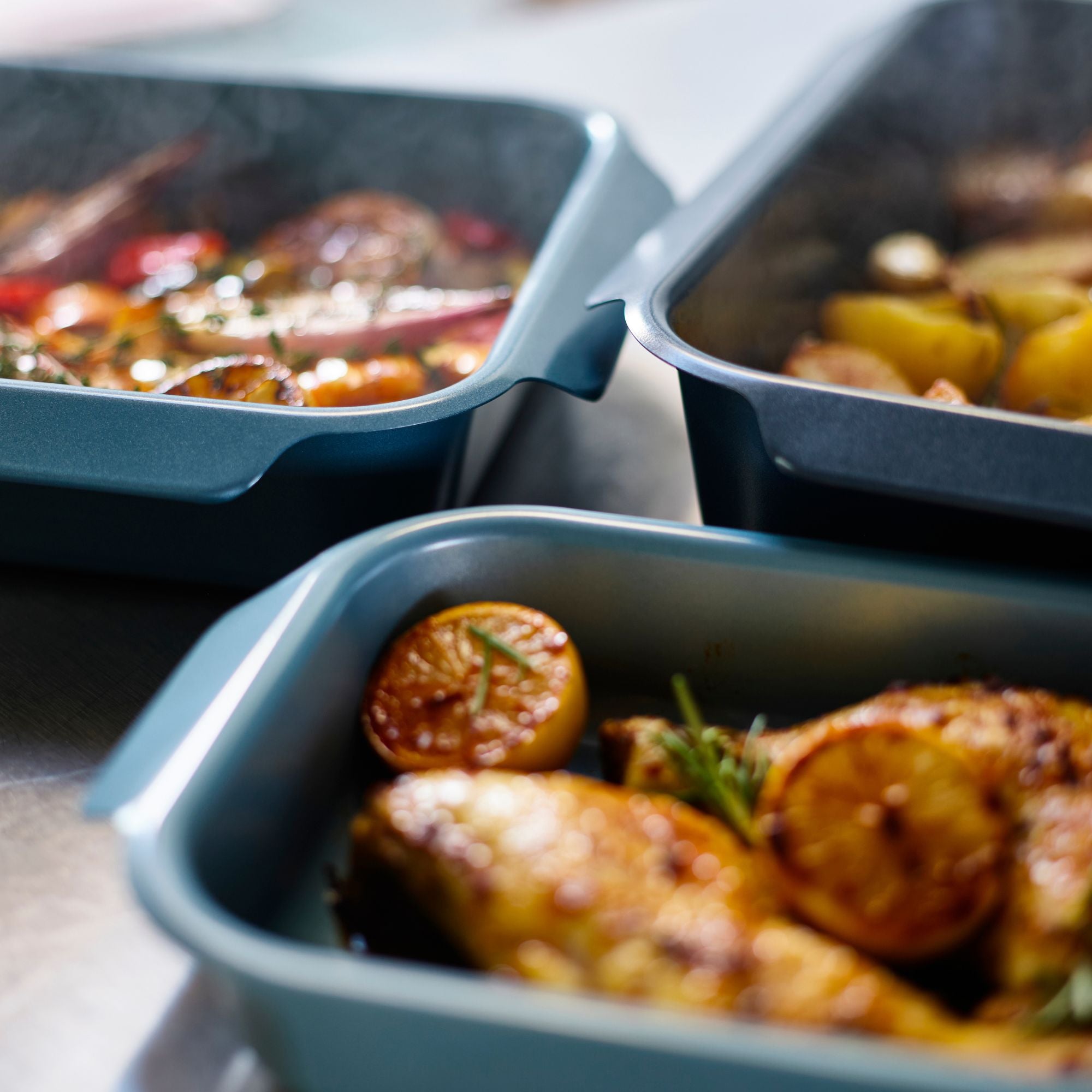 Designed with heavy gauge, carbon steel – it features easy pull handles on the sides to provide a larger gripping point when wearing oven gloves. What’s more, their clever design works perfectly for saving valuable drawer space too.