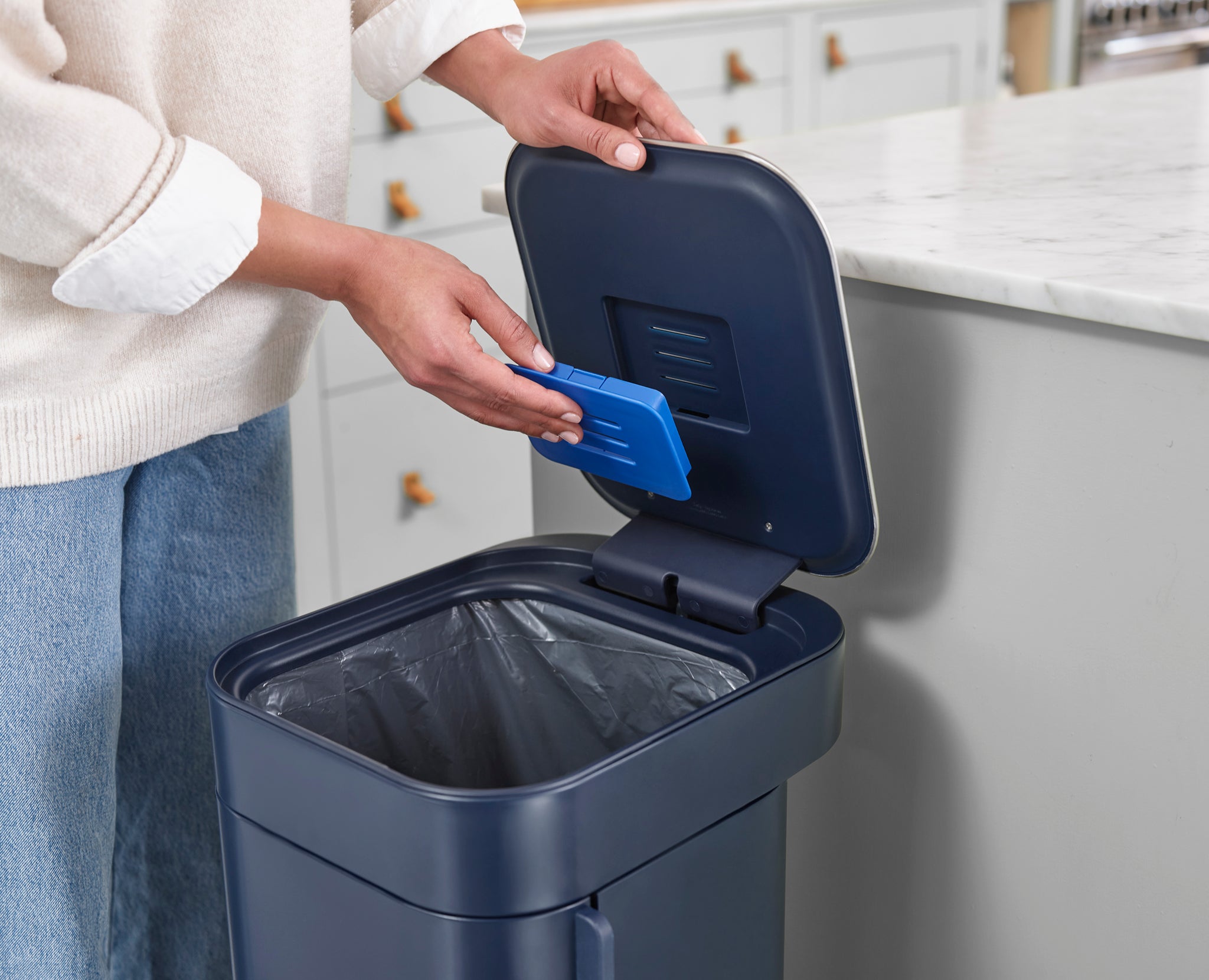 The soft-close, stainless-steel lid features a replaceable odour filter to help reduce unpleasant smells and a deep rim that hides untidy liner edges from sight. With Porta™, taking out the trash just got easier.